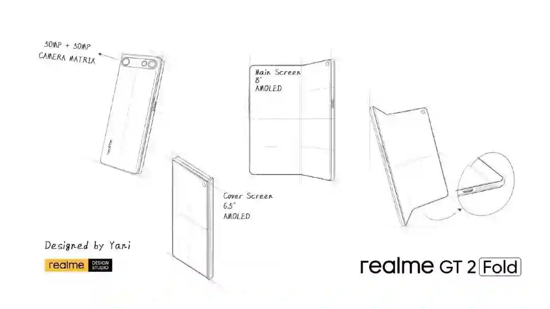 该博主曝光了一张 realme 折叠屏手机渲染图,该机型命名为 realme GT 2 Fold,采用左右式折叠方案,内屏 8 英寸 AMOLED,外屏 6.5 英寸 AMOLED,配备 50+50MP 镜头模组,与三星 Galaxy Z Fold3 一样。不过设计上不同之处在于,realme 折叠屏的小屏在右侧位置,与三星 Galaxy Z Fold3 的小屏位置恰好相反。而且这款 realme GT 2 Fold 主屏和小屏都是采用挖孔屏方案。