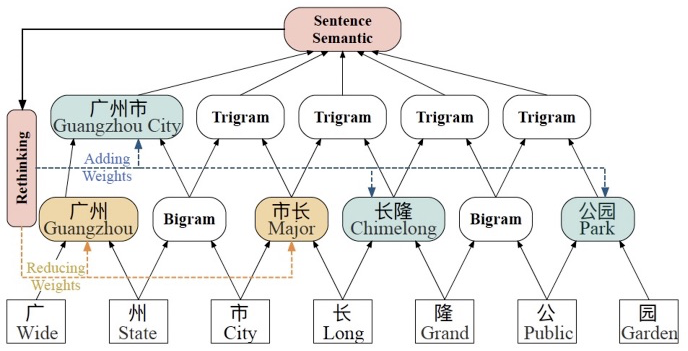 LR-CNN [25] 模型通过利用 CNN 模型,以及在 CNN 中引入 Rethink 机制来解决 Lattice-LSTM 模型不能并行化以及句子中词汇之间的混淆的问题。具体的,LR-CNN 将不同 layer 的卷积结果看作不同 n-gram 字符组的向量表示,再将句子中中的词汇向量以 attention 的方式整合到其对应的 n-gram 字符组的向量表示中,以此来整合词汇信息。