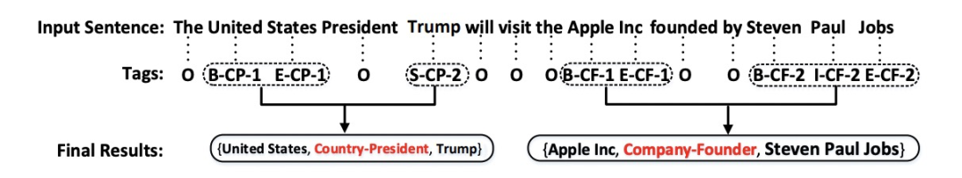 [63] Suncong Zheng, Feng Wang, Hongyun Bao, Yuexing Hao,Peng Zhou, Bo Xu. 2017. Joint Extraction of Entities and Relations Based on a Novel Tagging Scheme. Proceedings of the 55th Annual Meeting of the Association for Computational Linguistics, pages 1227–1236.