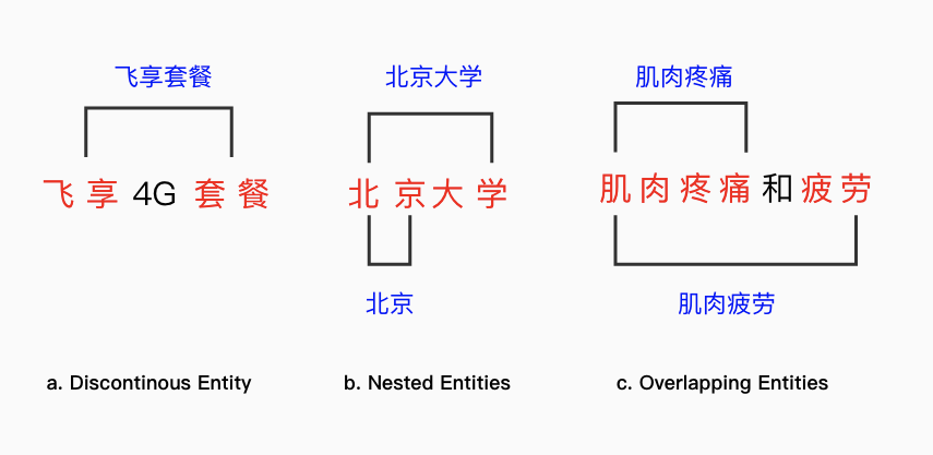 前述模型主要针对连续实体的抽取进行建模,在实际应用中还存在部分复杂实体的识别问题。这里的复杂指的是存在不连续的单实体以及多实体之间的覆盖和交叉关系。下图分别给出不连续实体(discontinuous entity),嵌套实体(nested entities)和 交叉实体(overlapping entities)的例子。