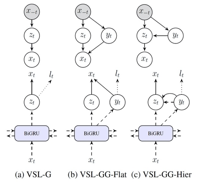 区别于 NCRF-AE 将标签信息直接建模为隐变量的方式,VSL-G [30] 通过引入纯粹的隐变量及隐变量之间的层次化结构,并且利用 variational lower bound 来构建重构损失函数,从而将有监督损失和无监督损失函数独立开来。此模型的重要意义在于引入并设计了隐变量之间的层次化结构,在此基础上引入的 VAE 下界损失对于有监督模型中参数起到了很好的正则化作用,从而达到了在小型数据集上就训练就有很好的泛化性能。