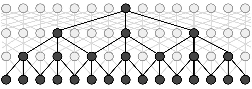 较新的,ID-CNNs [22] 利用 dilated CNN 模型(见下面示意图)解决了原本 CNN 感受野随着卷积层数的线性增长性的局限性,从而扩大了 Encoder 的感受野,进而能整合与利用更加长程的信息进行预测。