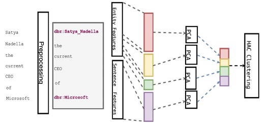 DRWE [7] 模型(见下图)采用无监督的方法进行开放关系识别。具体来说,其利用一些已有的工具识别出句子中的关键实体与实体对以及最短依存路径,之后结合预训练的词向量、实体对之间的最短依存路径和实体类型构建特征向量并进行 PCA 降维,进而通过层次聚类得到最终的关系聚类结果。