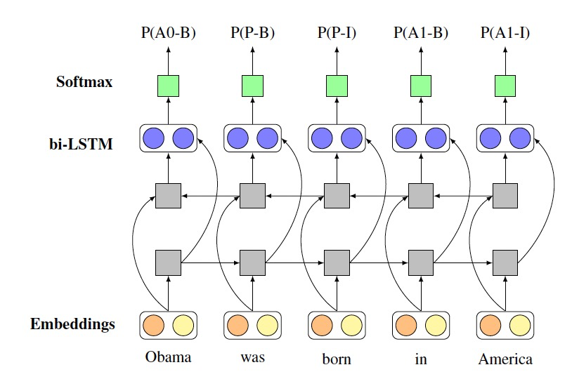 RnnOIE [9](见下图)采用有监督的方法,将 OpenIE 的 SPO 抽取建模为序列标注问题。具体来说,其将词的词向量和词性向量进行 concat,输入到 BiLSTM 中,最终以 softmax 输出进行标签分类。近几年随着 bert 的提出,大规模预训练模型带来了更好的泛化能力,Span Select 的方法,因为其可以利用更多语义信息,渐渐开始超越了传统 OpenIE 上基于 CRF 的相关方法。