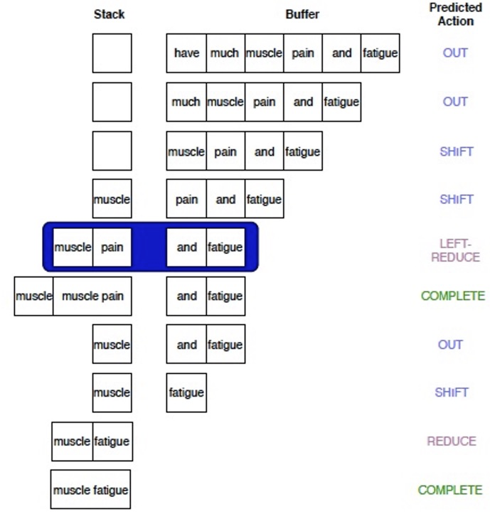 [34] 基于 transition-based 方法,引入更加丰富的 action 类别来解决不连续实体 overlapping 识别的问题。具体的,其使用 stack 存储处理过的 span,并使用 buffer 存储未处理的 token。NER 可以重塑为如下过程:给定解析器的状态,预测一个用于更改解析器状态的 action,重复此过程,直到解析器达到结束状态(即 stack 和 buffer 均为空)为止(图下图所示)。显然,此类方法不仅能解决不连续实体识别,也能解决实体嵌套和部分重叠,因此尽管此类方法相较于前述标注方法设计更加复杂,但其给出了解决连续和复杂实体识别的统一框架。此外,此方法属于序列决策问题,因而一个可能的方向是利用深度强化学习的方法来重塑目标函数和优化过程。
