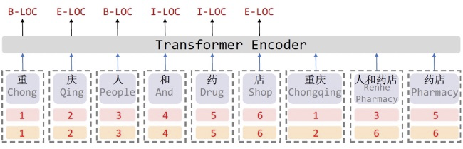 FLAT [26] 在融合字符与词汇的 Lattice 结构上,引入 Transformer 来进行建模。相对于上面以 RNN 和 CNN 为基础架构的模型,FLAT 能整合更加长程的信息的同时,还能更充分的利用 GPU 资源进行并行化训练和推理。