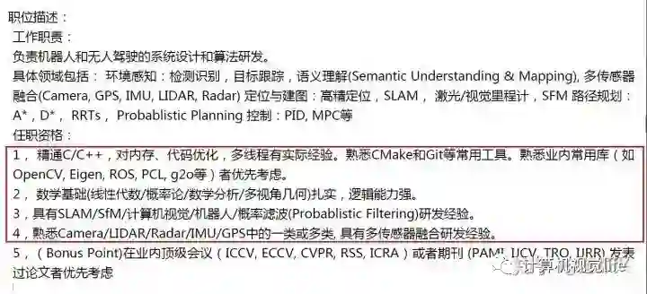 而且通过SLAM的学习,我们将学到定位导航需要的所有知识技能。下图是国内一家自动驾驶公司的招聘信息,我圈出了定位导航的职位要求。数学知识、滤波/优化方法、传感器融合,软件编程这些做机器人导航定位需要的知识技能,在SLAM的学习中都会涉及到。
