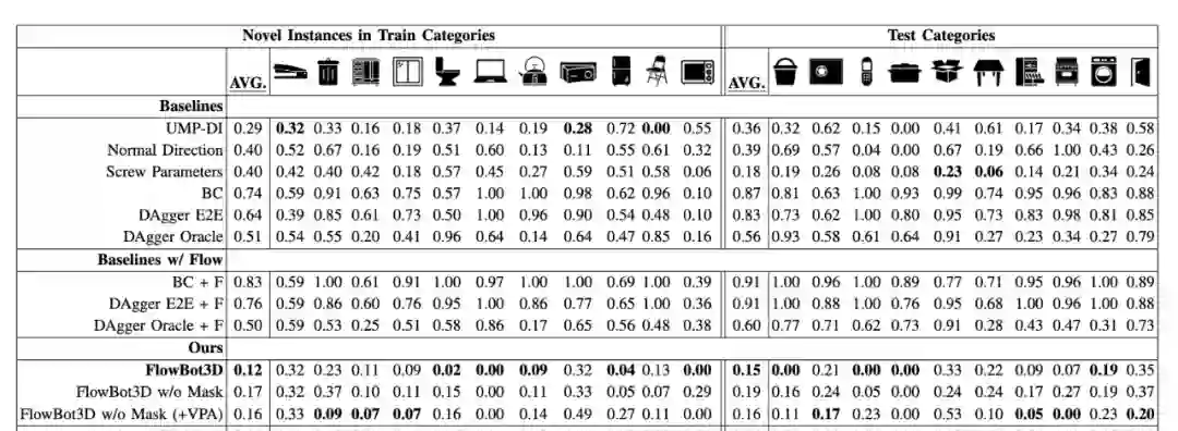 实验结果显示,FlowBot 3D 在操作多数物体(无论是训练时见过还是没见过的类别)时都能将对 “全开” 的距离达到 10% 以下,成功岭可以达到 90% 以上。相比之下,其他基于模仿学习(DAgger) 或者强化学习 (SAC) 的方法差了很远,并且缺少泛化性。