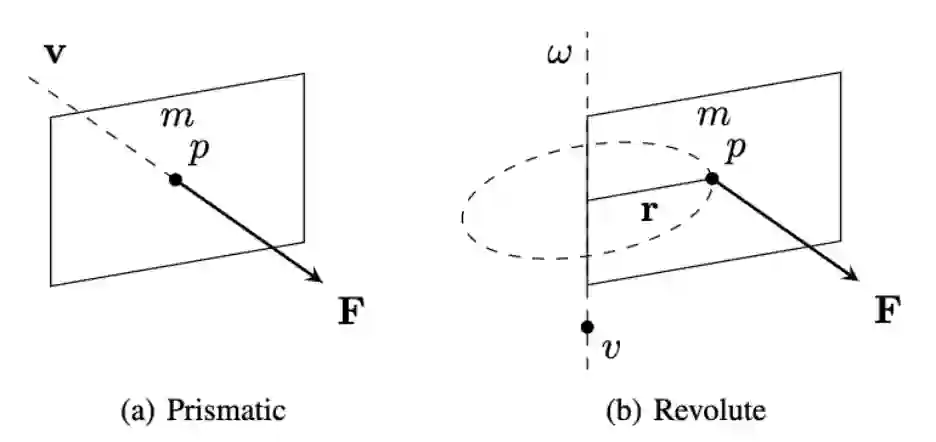 通过这种方式学习,FlowBot 3D 可以学习到在运动学约束下每个零件的运动方向以及该零件上每个点在受力相同的情况下运动的相对速度和相对方向(velocity)。常见的家用关节物品为抽动式(prismatic)和旋转式(revolute)两种。对于抽动式零件,比如抽屉,在抽屉面上的每个点收到相同外力下的运动方向和速度是相同的。对于旋转式零件,比如门,在门面上的每个点收到相同外力下的运动方向是相同的,但是速度却是离旋转轴越远越大。研究者用机器人学中的物理定律(screw theory)证明了长度最长的 3D Articulated Flow 可以最大化物体的加速度。根据牛顿第二定律,这一策略是最优解。