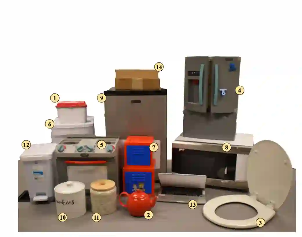 FlowBot3D 在真实世界实验所用到的家用物品(包括垃圾桶,冰箱,马桶盖,盒子,保险箱等。