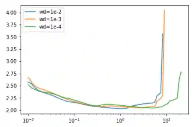 可以利用这个性质来设置一些超参数,如去做那种衰减率:Leslie 建议,可以在几组权重衰减率上运行 Learning Rate Finder,在能够接受使用高最大学习率进行训练的结果中,选择最大的一个。我们实验中选择的是 10^-4。
