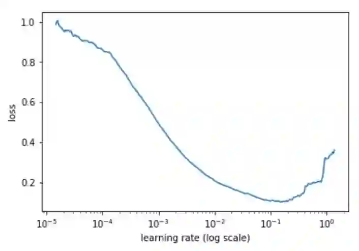 可以通过这篇文章学习如何实现 Learning Rate Finder,这里简述如下:在开始训练模型的同时,从低到高地设置学习率,直到损失(loss)变得失控为止。然后将损失和学习率画在一张图中,在损失持续下降、即将达到最小值前的范围上取一个值作为学习率。下例中,可以在 10^-2 到 3×10^-2 之间任意取一个值。