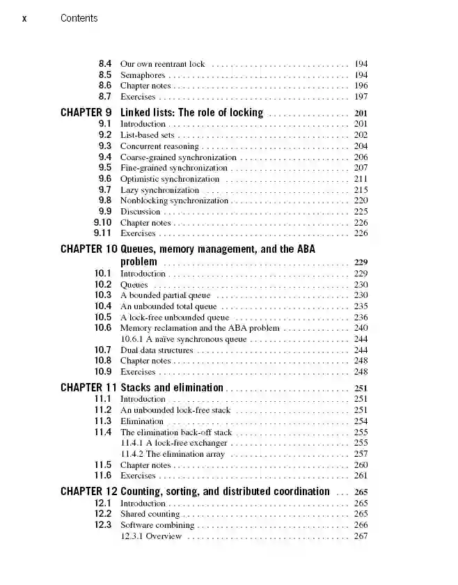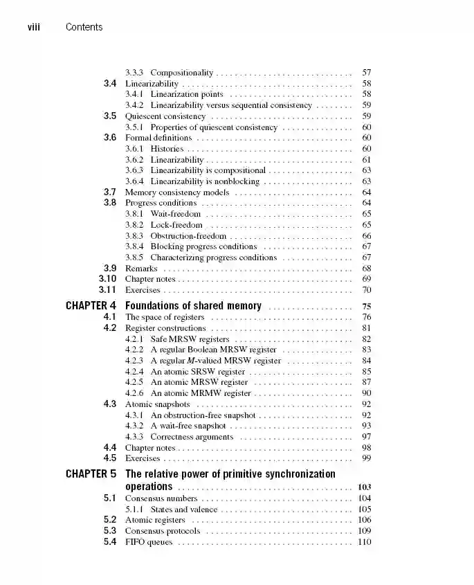 本书的第一部分涵盖了并发编程的原则,展示了如何像并发程序员一样思考,开发基本技能,比如理解操作“发生”的时间,考虑所有可能的交错,以及识别进展的障碍。像许多技能一样——开车、做饭或欣赏鱼子酱——思考必须同时培养,并且可以通过适度的努力来学习。想要立即开始编程的读者可以跳过这一节的大部分内容,但仍然应该阅读第2章和第3章,它们涵盖了理解本书其余部分所需的基本思想。我们首先来看一下经典的互斥问题(第2章)。这一章对于理解为什么并发编程是一个挑战是必不可少的。它涵盖了公平性和死锁等基本概念。然后我们会问并发程序的正确含义是什么(第3章)。我们会考虑几种不同的条件,以及在哪些情况下人们可能会使用每种条件。我们将讨论并发计算所必需的共享内存的属性(第4章),以及实现高并发数据结构所需的同步原语(第5章和第6章)。