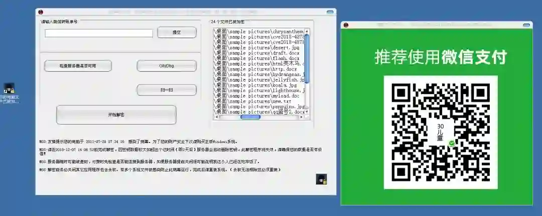 “微信勒索病毒”,本来就是 LSY 老湿想要小范围传播的勒索软件,于是根本都没做什么伪装,还用了微信支付码,估计在他心里,预计这个病毒会感染几十人,然后其中十个人付赎金,赚个一千多块钱完事。