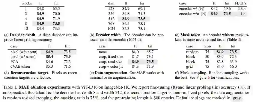 Decoder Design 从Table1a与Table1b可以看到:解码器的设计可以非常灵活 。总而言之,默认解码器非常轻量,仅有8个模块,维度为512,每个token的计算量仅为编码的9%。