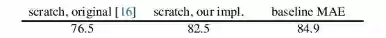 Baseline:ViT-Large 。我们采用ViT-Large作为消融实验的骨干,上表为从头开始训练与MAE微调的性能对比。可以看到:从头开始训练(200epoch),ViT-L的性能为82.5%且无需强正则技术;而MAE(注:仅微调50epoch)则取得了大幅性能提升。