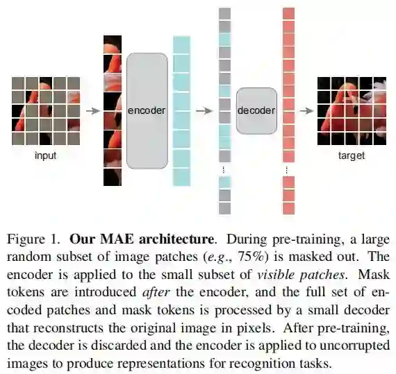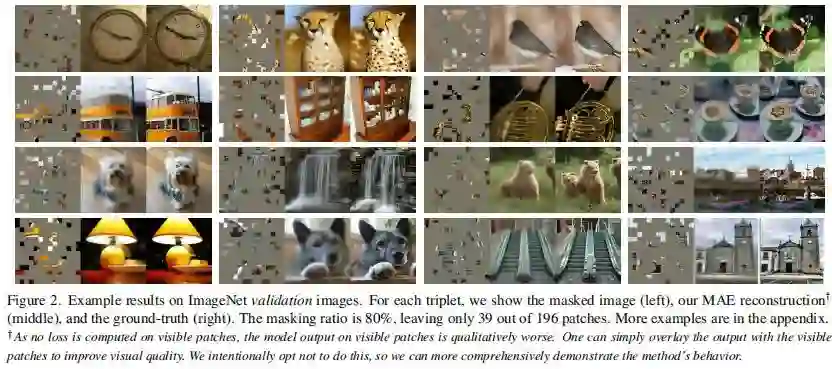 我们设计了一种非对称编解码架构,其中编码器仅作用于可见块(无需mask信息),而解码器则通过隐表达与mask信息进行原始图像重建;