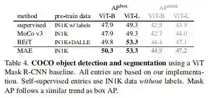 上表给出了COCO检测与分割任务上的迁移性能对比,可以看到:相比监督预训练,MAE取得了全配置最佳 。当骨干为ViT-B时,MAE可以取得2.4AP指标提升;当骨干为ViT-L时,性能提升达4.0AP。