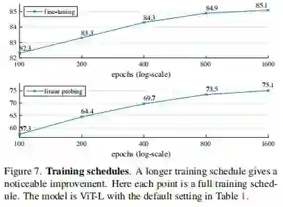 Training Schedule 下图给出了不同训练机制的性能对比(此时采用了800epoch预训练),可以看到:更长的训练可以带来更定的精度提升 。作者还提到:哪怕1600epoch训练也并未发现linear probing方式的性能饱和。这与MoCoV3中的300epoch训练饱和截然相反 :在每个epoch,MAE仅能看到25%的图像块;而MoCoV3则可以看到200%,甚至更多的图像块。