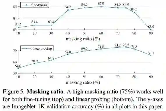 Masking ratio 下图给出了掩码比例的影响,可以看到:最优比例惊人的高 。掩码比例为75%有益于两种监督训练方式(端到端微调与linear probing)。这与BERT的行为截然相反,其掩码比例为15%。
