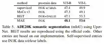 上表给出了ADE20K语义分割任务上的迁移性能对比,可以看到:MAE可以大幅改善ViT-L的性能,比监督训练高3.7。