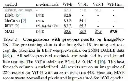 搭配MAE的ViT-H取得了ImageNet-1K数据集上的新记录:87.8%;同时,经由MAE预训练的模型具有非常好的泛化性能。