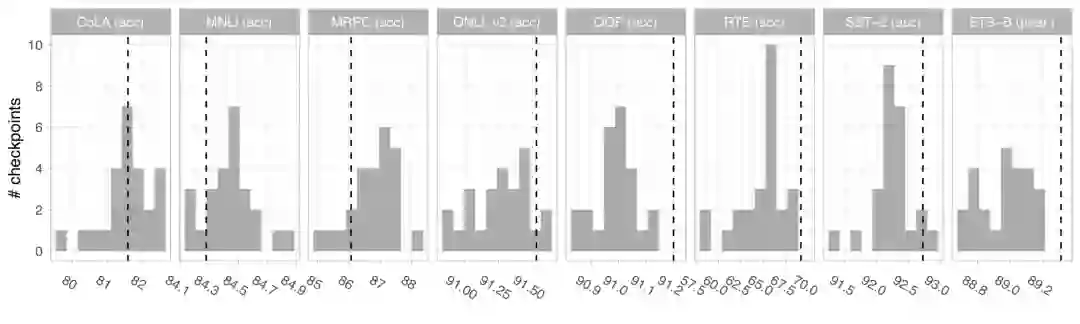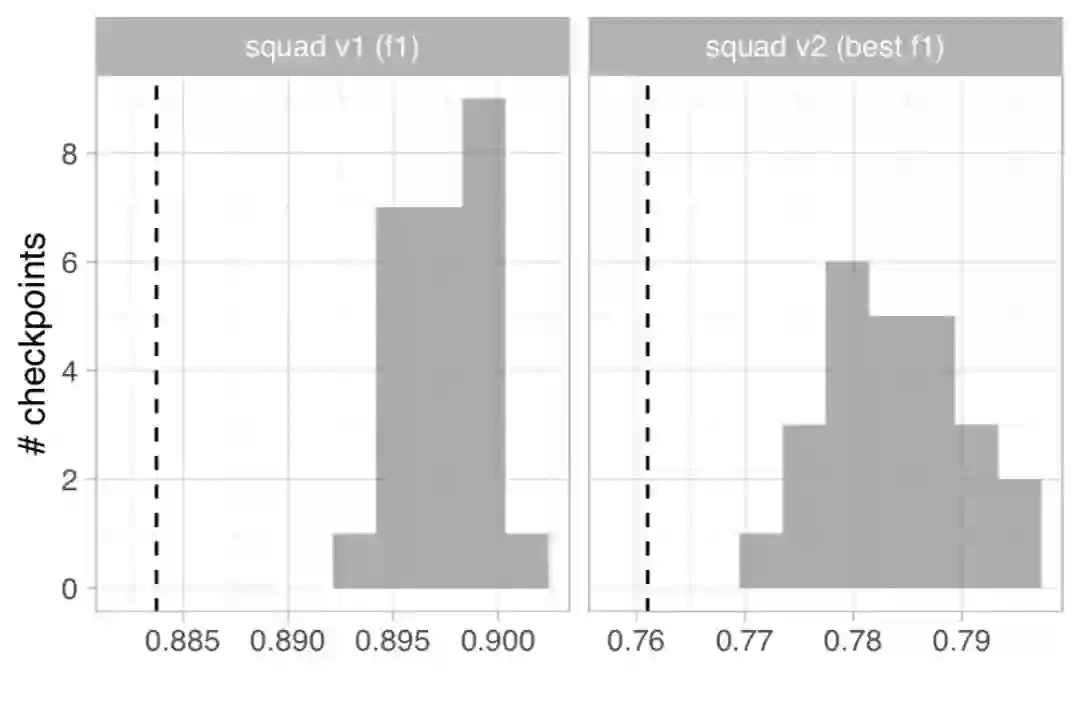 具体的,在GLUE及SQuAD下游任务上的表现如下图所示。每张图为25个格子,分别表示25个不同随机数种子下预训练的模型,在对应任务验证集上的表现。对每个预训练的随机数种子和每个下游任务的组合,均采用五次实验计算均值的方式汇报。虚线表示原始BERT汇报的结果。