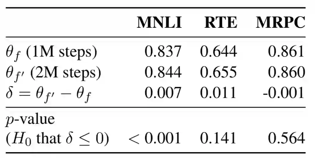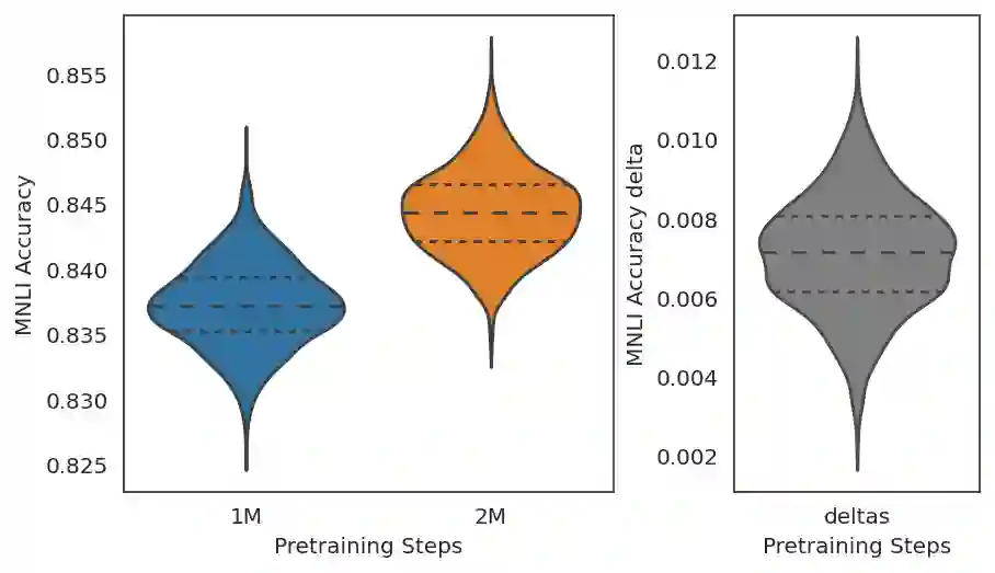 利用成对采样的策略可以进一步看出,虽然MNLI任务上,1M和2M迭代步数的预训练模型性能分布有较为明显的重叠。但两者具有较为明显的相关性,即在同一随机种子下,2M迭代的模型表现有很大概率高于1M迭代的模型。这导致了极高的显著性。