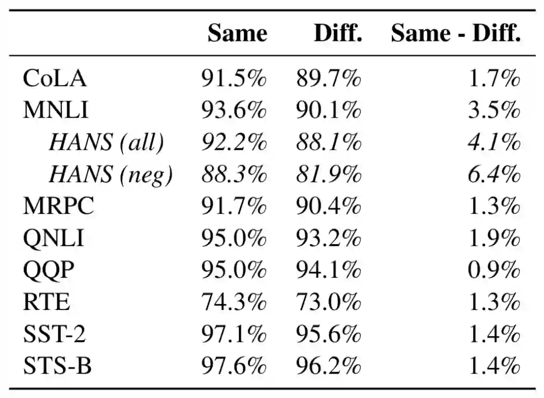 作者表明,在预训练阶段采用不同的随机数种子,对模型表现稳定性有较为明显的影响。如下表所示。这里统计的是下游任务中,样例级别(instance-level)的一致率。Same表示采用相同的预训练种子,Diff.表示采用不同的预训练种子。从表中可以看出,预训练时使用相同的随机数种子,模型在下游任务中保持有较高的一致率(90%以上);而如果预训练时采用不同的随机数种子,下游任务的预测一致率会有1%~2%的下降。这一下降在HANS[2] (一个MNLI相关的对抗样本数据集)上表现得更为明显,可以达到 4%~7% 。