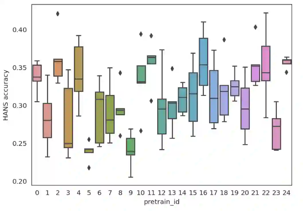 特别地,25个预训练随机数种子下,BERT模型在HANS(neg)[2]上的表现,如下图所示。可以看到,随着预训练中随机数种子的变化,模型在下游任务上的准确率可以有超过20%的波动。远大于同预训练种子的10%以内的准确率波动。因此,你的论文的实验结论可能仅在一个BERT的随机种子下成立。更换预训练种子之后,结论可能不再成立。我们也可以由此看到,利用不同随机数种子下BERT预训练的结果,对探究实验结论的鲁棒性十分必要。