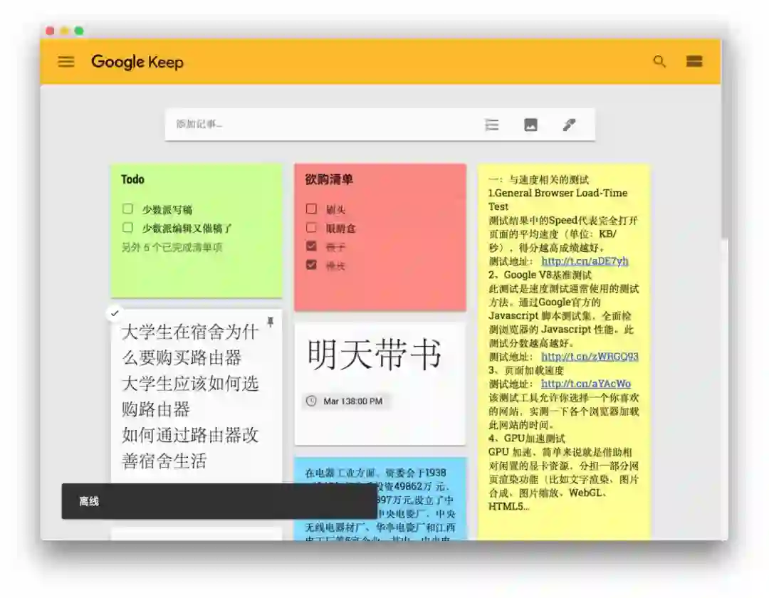 ⏰叮叮叮……闹钟在七点钟准时响了起来,我不得不铺好被子下床关掉闹钟,刚一关掉,手机上的通知栏就来了一条备忘提醒。原来是昨晚我在 Mac 上用「Google Keep」记下的今天要给同学带的书。Keep 没有原生 Mac 应用,但是 Chrome 商店里有一款可以离线使用的 Keep 应用,能在 Launchpad 生成独立的应用图标,使用起来非常方便。