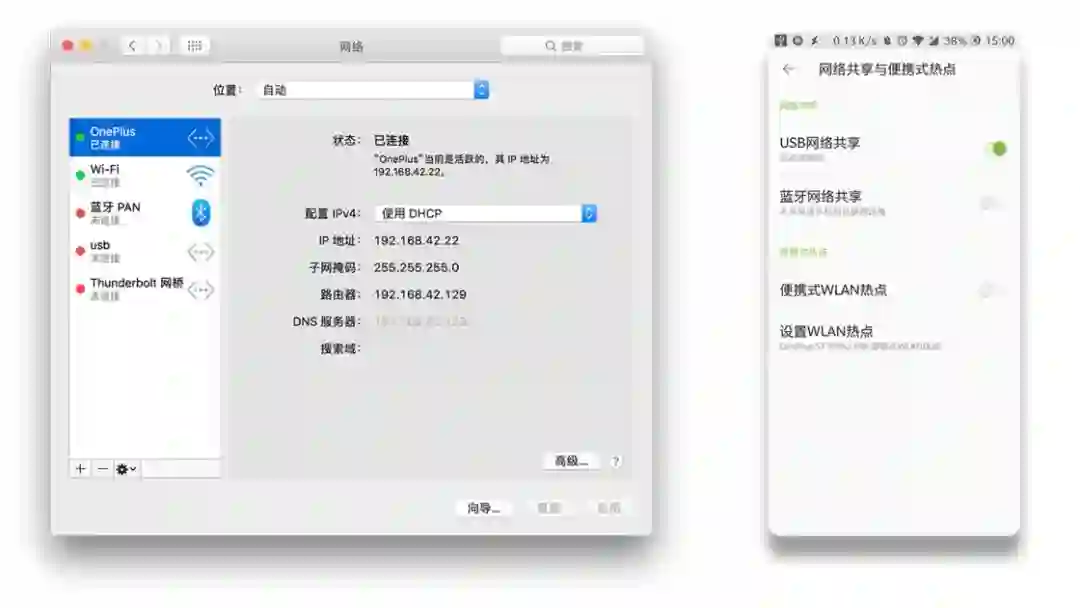 坐在图书馆,里面的无线网络却非常不稳定,无奈我只能把手机当成网络接入点。直接开热点电池损耗大,没多久电量就见红,所以我安装了一款开源的软件 HoRndis,这样使用数据线连接 MacBook,打开设置中的网络共享,勾选 USB 网络共享即可。这样既可以给手机充电,又能给电脑高速上网。