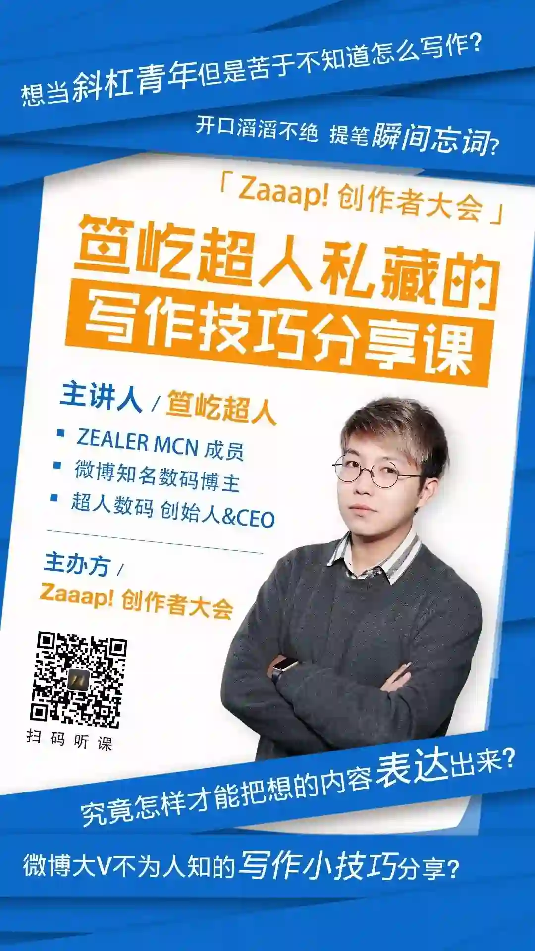 超人数码CEO&创始人,微博知名数码博主,不仅能拍视频,更是写的一手好文案。这次他将分享他这么多年压箱底的新媒体写作技巧!