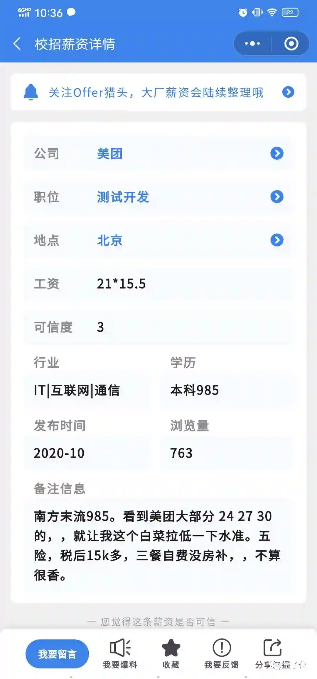 而且从爆料者自述学历信息来看,普遍985硕士毕业,有一位拿到21k(年薪32w)“白菜价”的,说自己是“南方末流985本科”: