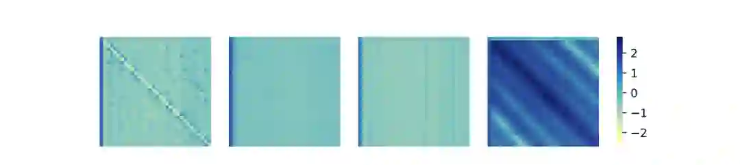 我们对展开后的四项做了可视化。如下图所示,可以看到中间两项看起来很均匀,说明position 和 token 之间确实没有太强的关联;token 和 position 用了相同的矩阵做 QKV 的变换。但 position 和 token 所包含的信息不一样,共享矩阵也不合理。