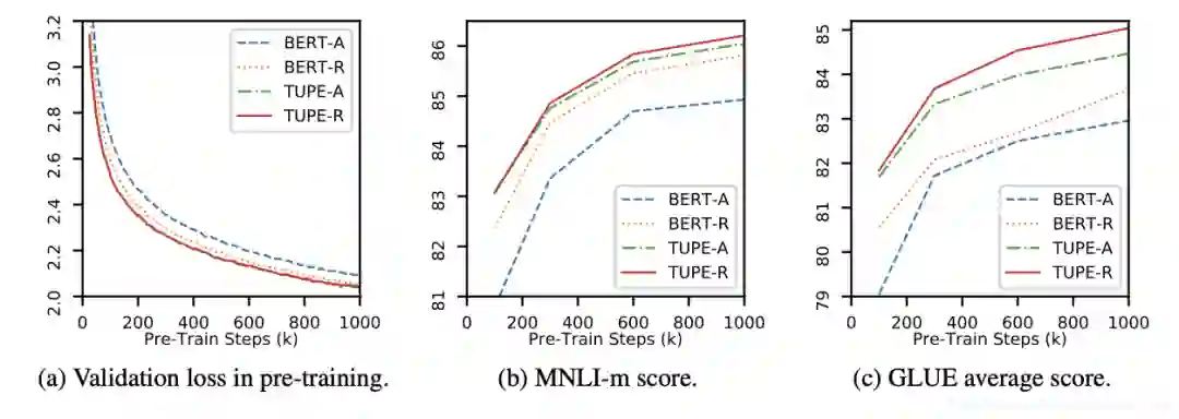 实验结果表明,按上面的式子把 positional embedding 从 input 拆开后,不仅 pre-training loss 收敛得更快,下游任务的表现也更好。另外,我们还特殊处理了 [CLS] token 的 position,使其不会因 positional locality 而忽略了整个句子的信息。这个也能带来不小的提升。整体的实验结果如下,可以看到,我们的方法不仅最后比 baseline 要好很多,并且可以在 30% (300k-step) 的时候,就达到 baseline 在 1000k-step 时的效果。