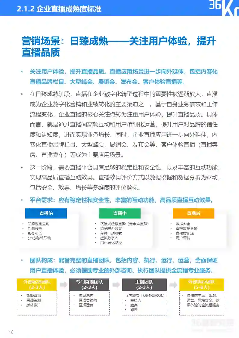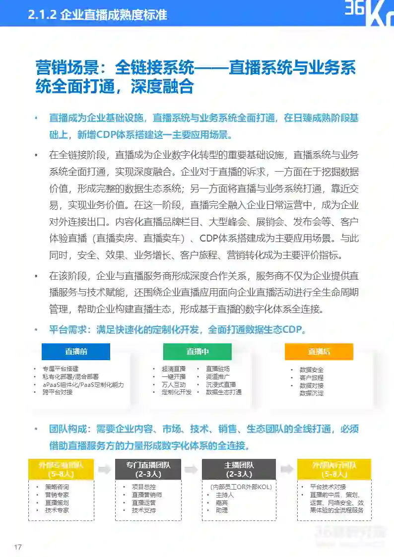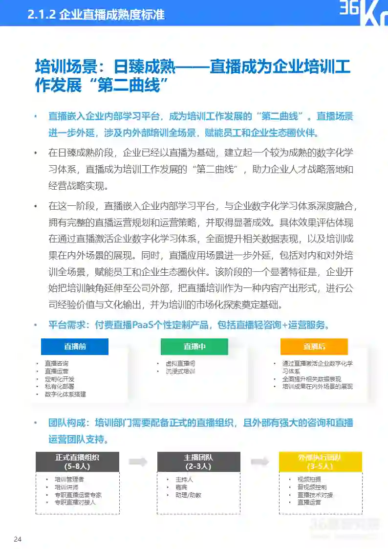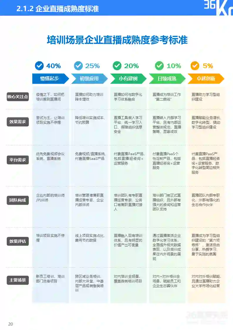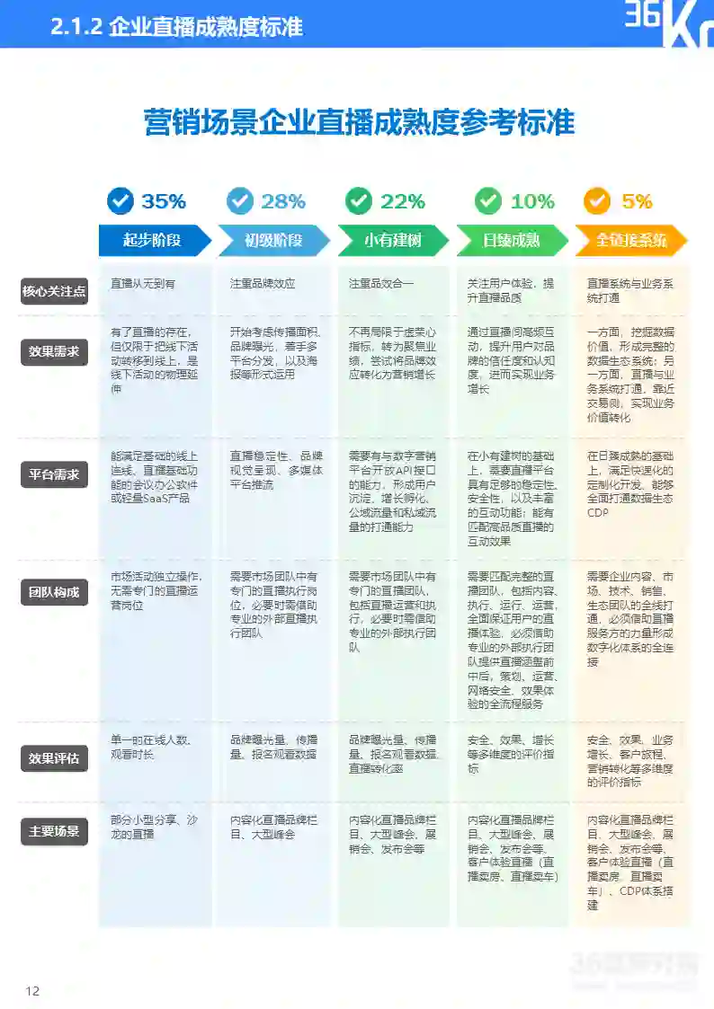直播研究院和36氪研究院将企业直播分为营销和培训两大类应用场景,并将直播应用成熟度由浅至深划分为五大阶段,从核心关注点、效果需求、平台需求、团队构成、效果评估、主要场景等维度来描摹各阶段主要特征,帮助企业评估自身直播应用成熟度及未来所需提升方向。在实践中,因直播通常与企业具体业务相结合,应用场景和需求可能与标准化指标存在一定变通,企业可依据实际情况灵活使用该标准。