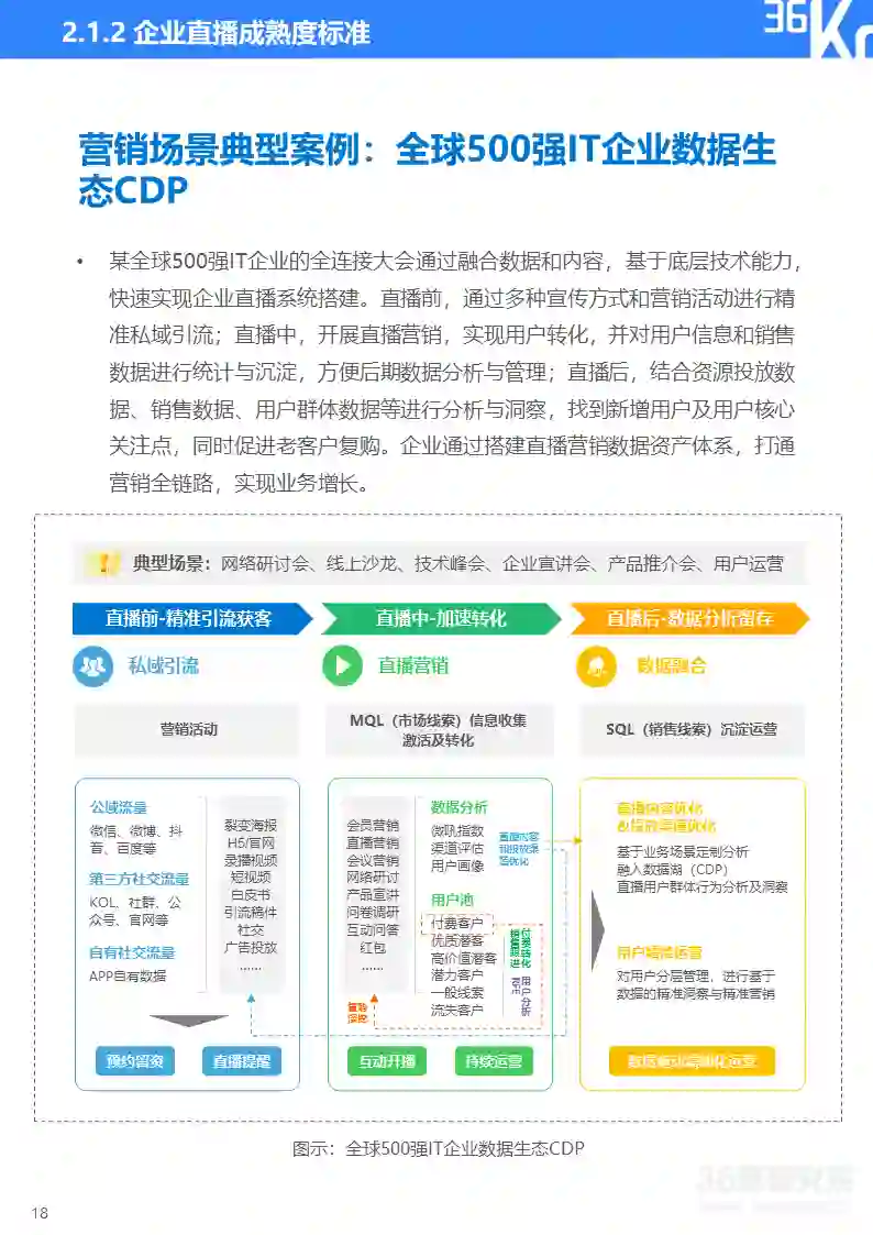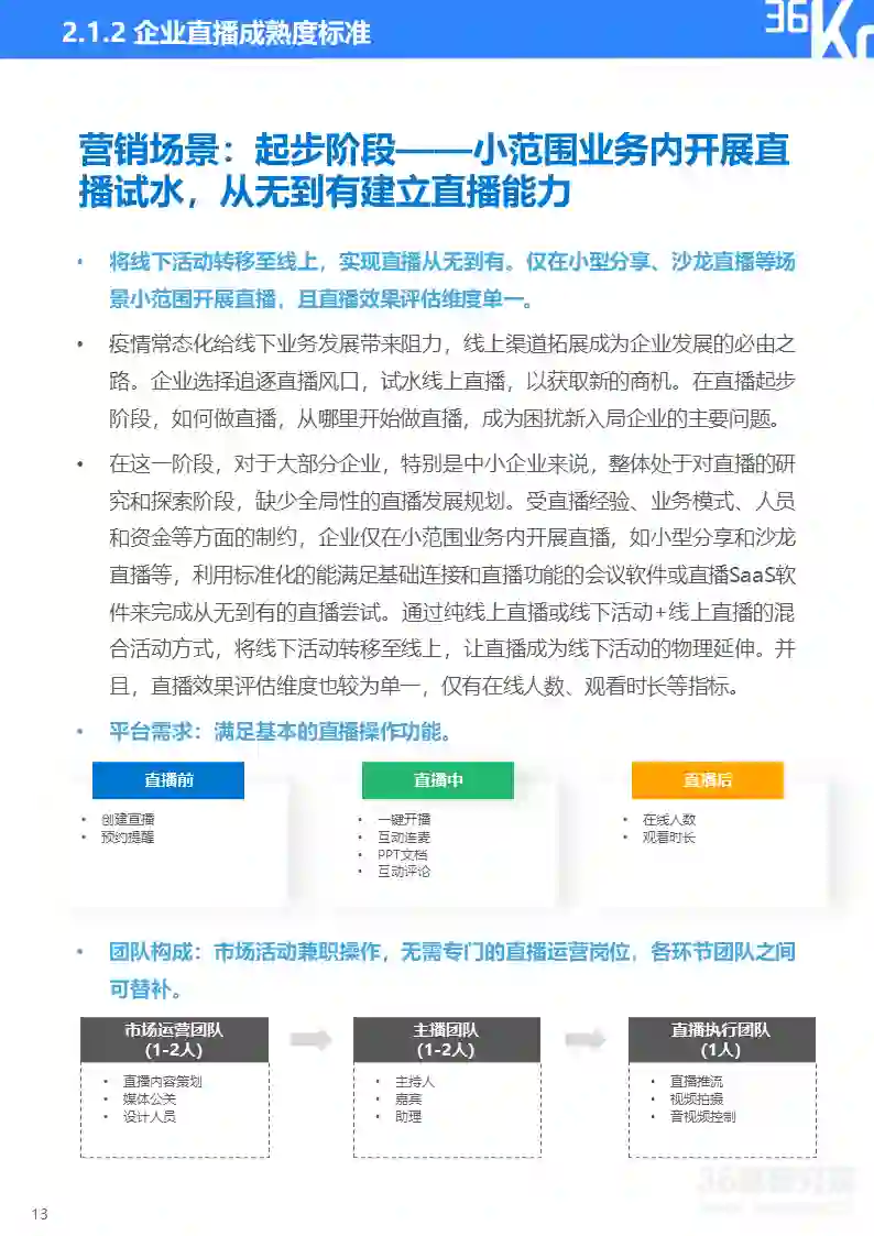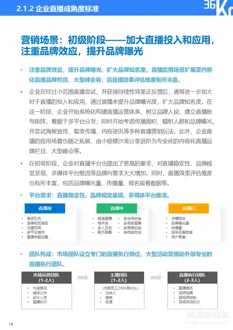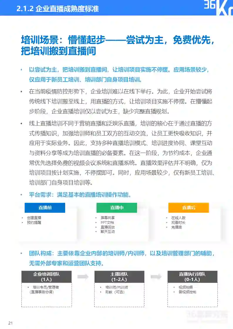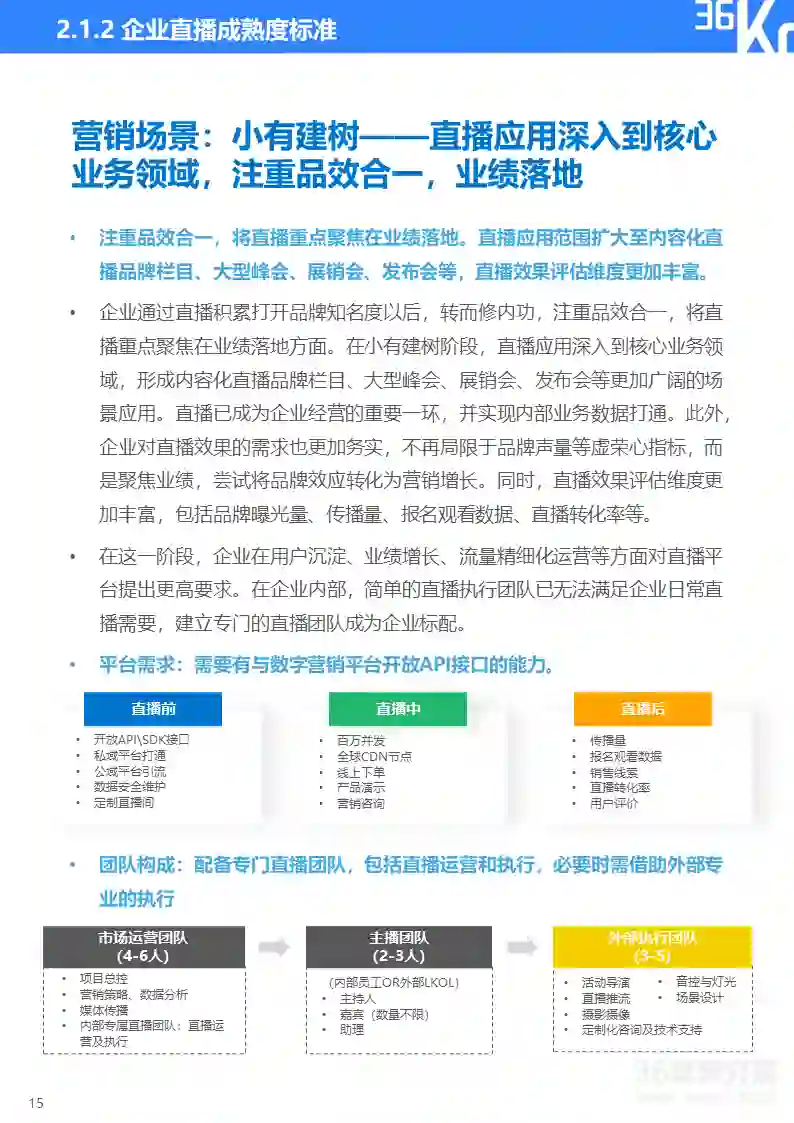 直播研究院和36氪研究院将企业直播分为营销和培训两大类应用场景,并将直播应用成熟度由浅至深划分为五大阶段,从核心关注点、效果需求、平台需求、团队构成、效果评估、主要场景等维度来描摹各阶段主要特征,帮助企业评估自身直播应用成熟度及未来所需提升方向。在实践中,因直播通常与企业具体业务相结合,应用场景和需求可能与标准化指标存在一定变通,企业可依据实际情况灵活使用该标准。