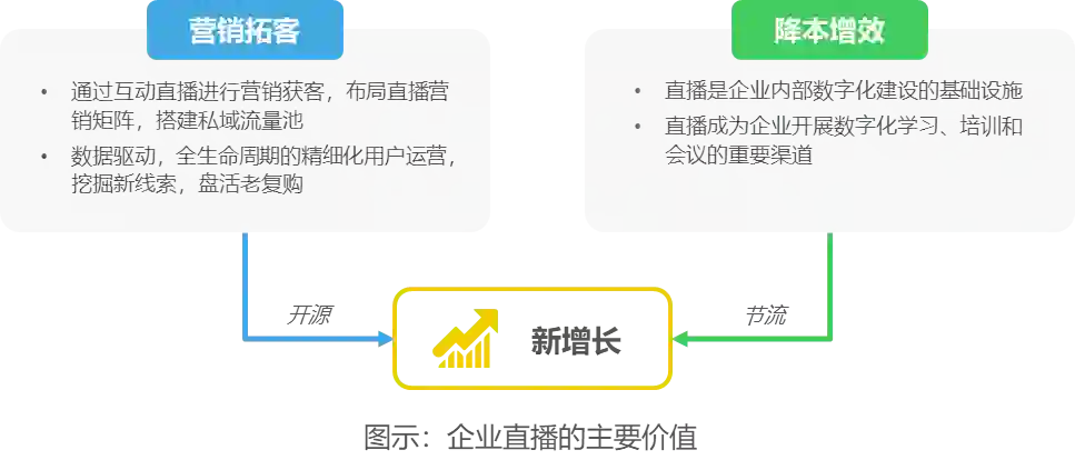 企业应用直播为数字化转型赋能,通过开源与节流并举,实现新增长。一方面,利用互动直播进行营销获客,布局直播营销矩阵,搭建私域流量池,开展数据驱动的全生命周期精细化用户运营,增加企业营收;另一方面,将直播作为企业内部数字化工具,开展直播数字化学习、数字化培训和在线会议,打破时间和空间限制,降低差旅成本,提高内外部沟通效率,实现降本增效。