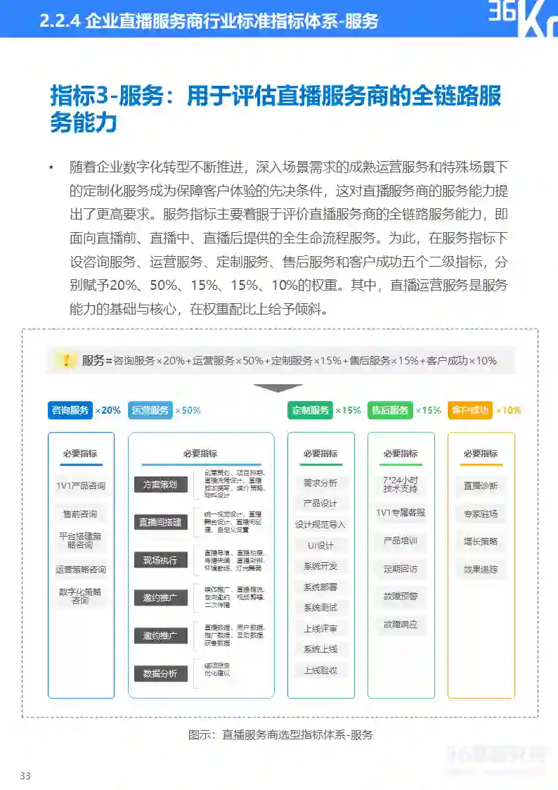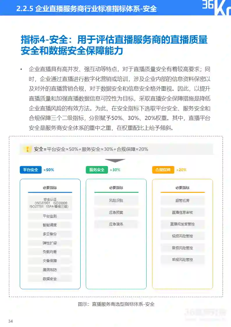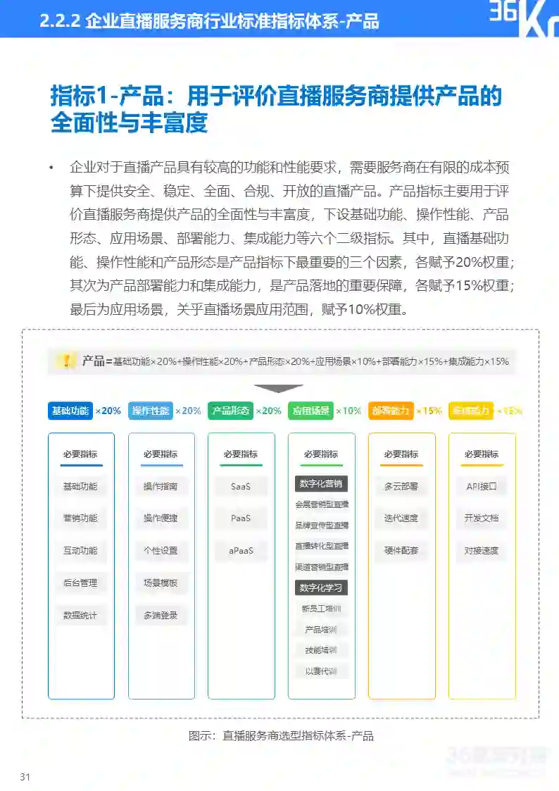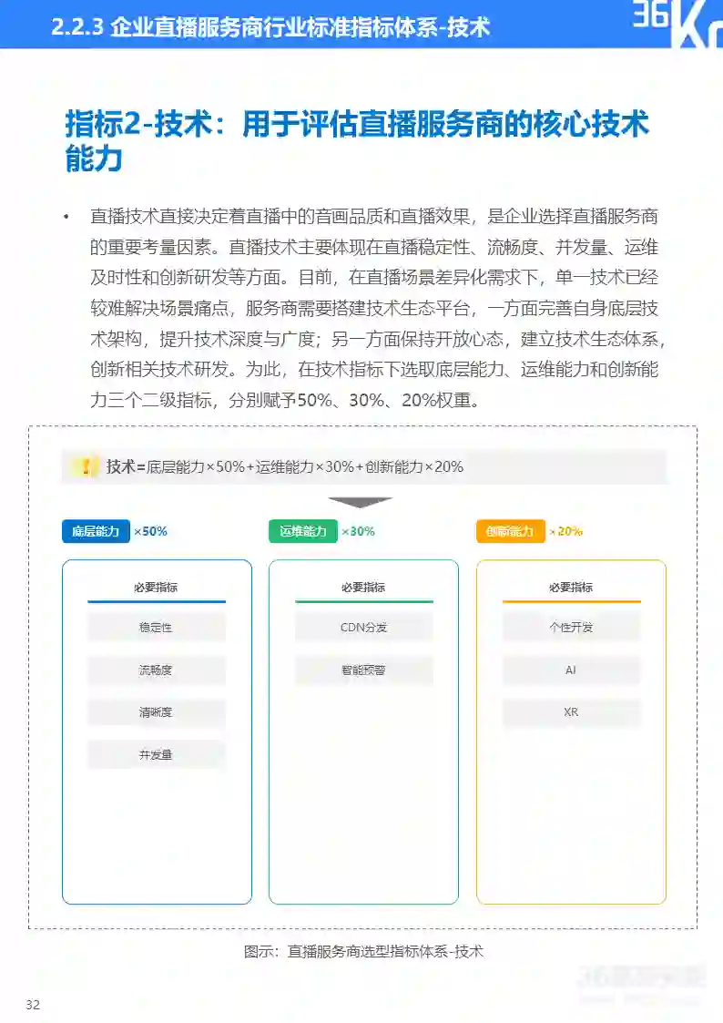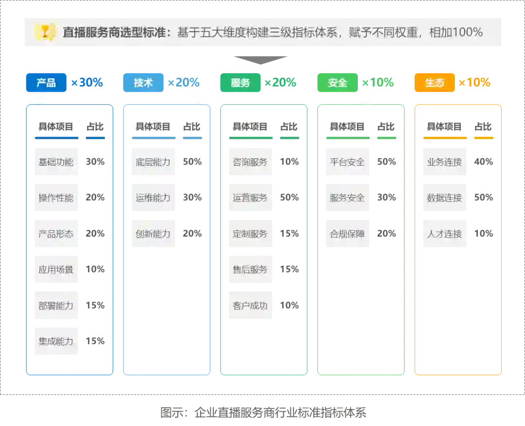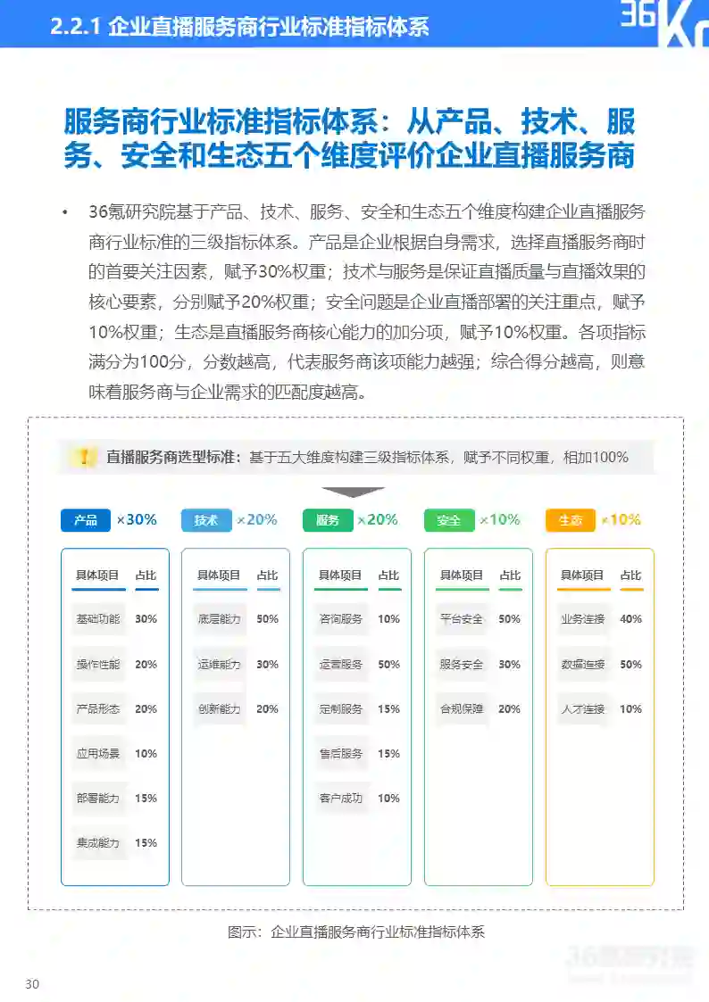 36氪研究院基于产品、技术、服务、安全和生态五个维度构建企业直播服务商行业标准的三级指标体系。产品用于评价直播服务商提供产品的全面性与丰富度;技术用于评估直播服务商的核心技术能力;服务用于评估直播服务商的全链路服务能力;安全用于评估直播服务商的直播质量安全和数据安全保障能力;生态用于评估直播服务商的资源连接和综合服务能力。