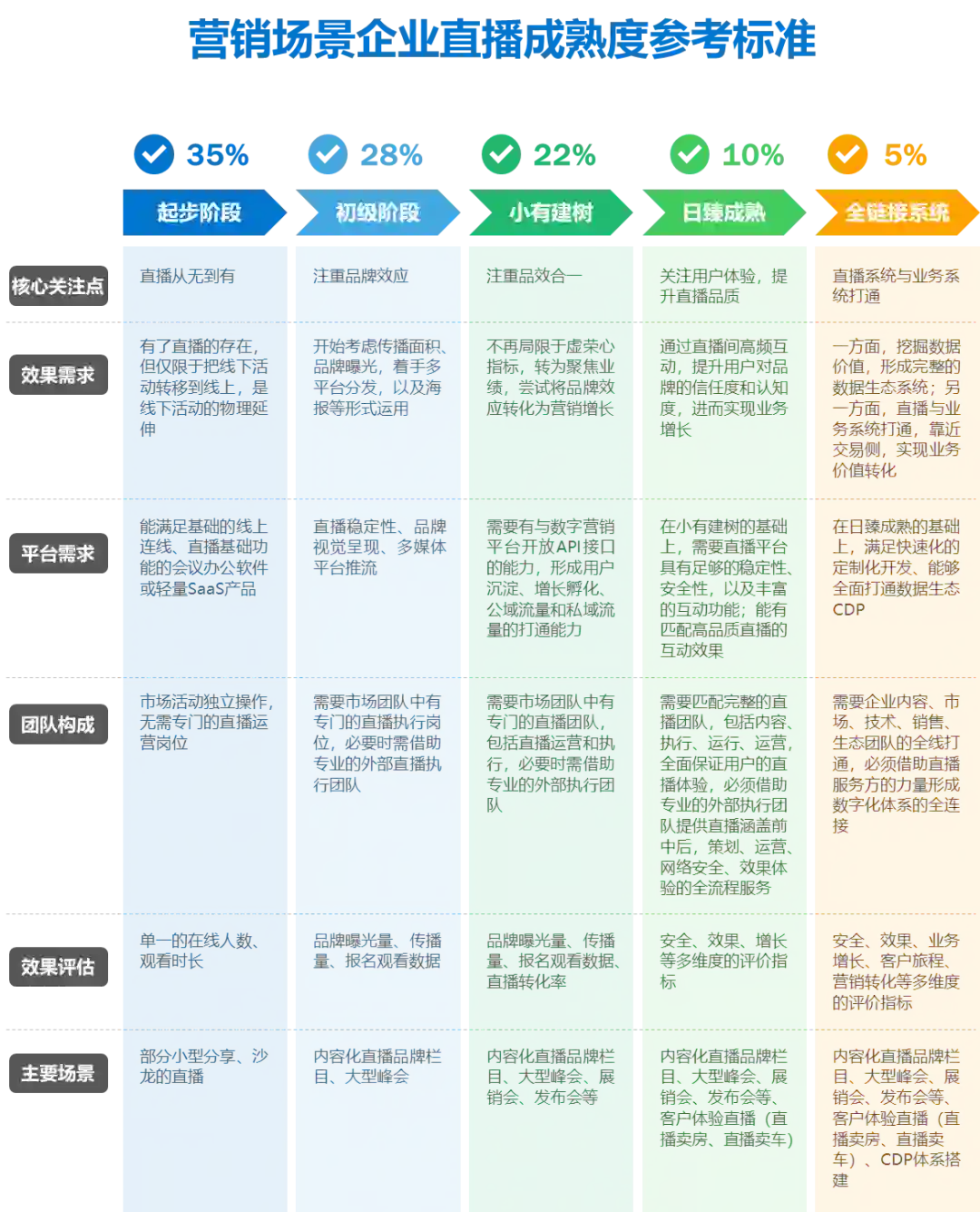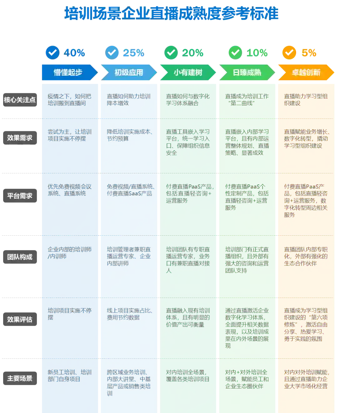 企业直播成熟度标准将直播应用划分为五个阶段,帮助企业评估自身直播应用成熟度
