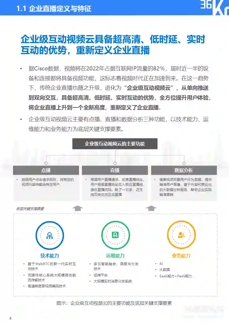 视频时代正在加速到来,传统企业直播在这一趋势下随之升级进化为“企业级互动视频云”。企业级互动视频云改变了以往直播的单一推送模式,具备双向交互能力,以超高清、低时延、实时互动的优势,全方位提升用户体验,重新定义了企业直播。
