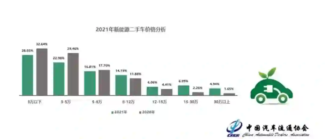 中国汽车流通协会的调研数据显示,2021年全年,新能源二手车价格在5万元以下的占比为50%,其中3万元以下的占比为28.02%,3-5万元的占比为22.98%。有82%的新能源二手车交易价格不足12万元。