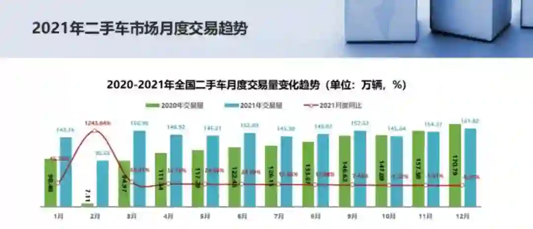 2020年初,受到疫情的影响,二手车交易量萎缩。但在2020年底,二手车交易量强势反弹,据中国汽车流通协会的数据,2020年12月,中国二手车交易量突破170万辆,甚至高于2021年12月的交易量。