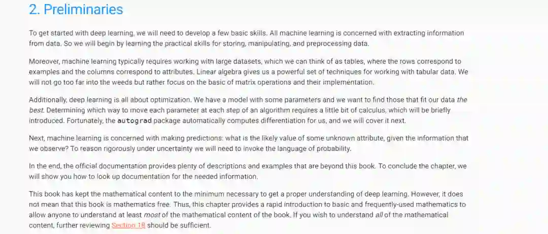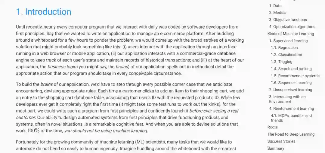 导读】 在过去的五年中,深度学习震惊了世界,推动了计算机视觉,自然语言处理,自动语音识别,强化学习和统计建模等各个领域的快速发展。有了这些先进技术,我们现在可以制造出比以往任何时候都更自主驾驶的汽车(也比你想象中的一些公司的自主性要小),智能回复系统可以自动起草最普通的电子邮件,帮助人们从巨大的收件箱中挖出来,在像围棋这样的棋盘游戏中主宰世界上最优秀人类的软件代理商,这一壮举一度被认为还有几十年的时间。这些工具已经对工业和社会产生了越来越广泛的影响,改变了电影的制作方式,疾病的诊断,并在从天体物理学到生物学的基础科学中发挥着越来越大的作用。这本书代表了作者的尝试,动手学习深度学习,教你相关概念,环境,和代码。