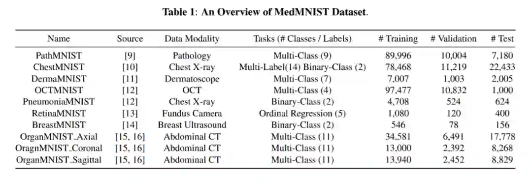 表 1:MedMNIST 数据集概览,涵盖数据集的名称、来源、数据模态、任务和数据集分割情况。