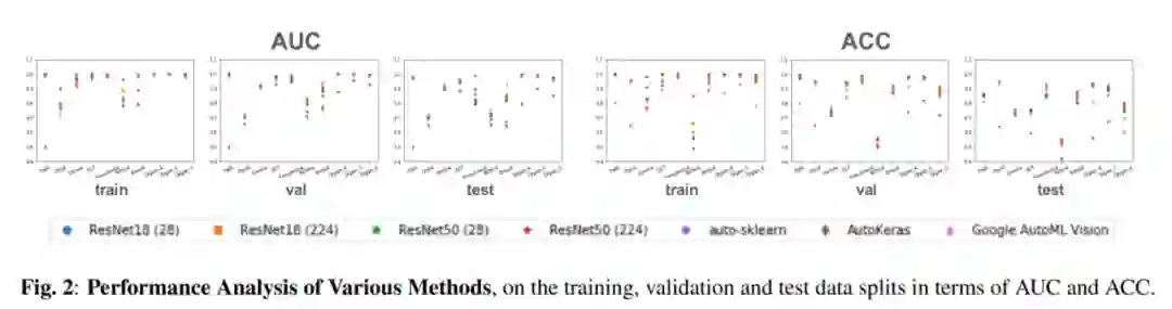 从表 2 中可以看出,Google AutoML Vision 整体性能较好,但并不总是最优,有时甚至输给 ResNet-18 和 ResNet-50。auto-sklearn 在大部分数据集上表现不好,这表明典型的统计机器学习算法在该医疗图像数据集上性能较差。AutoKeras 在大规模数据集上性能较好,在小规模数据集上表现相对较差。没有哪种算法可以在这十个数据集上取得很好的泛化性能,这有助于探索 AutoML 算法在不同数据模态、任务和规模的数据集上的泛化效果。