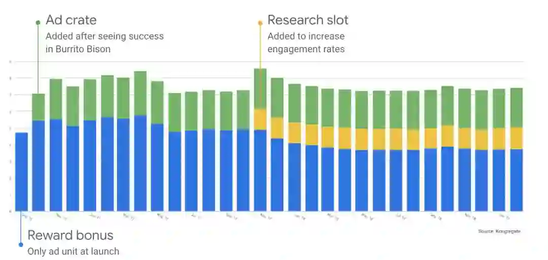 △ 加入广告宝箱 (Ad crate) 和广告研究插槽 (Research slot) 之后广告参与度都有提升,数据的整体节奏十分稳健