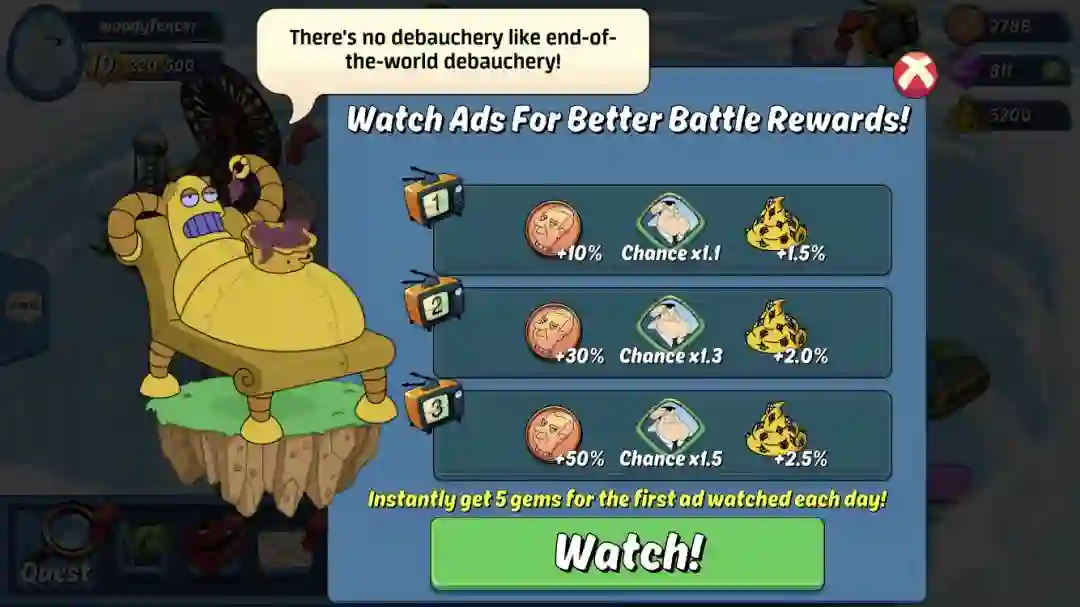 广告鼓励重复参与: 玩家可以通过观看多个广告来 “叠加” 奖励,或叠加百分比乘数。
