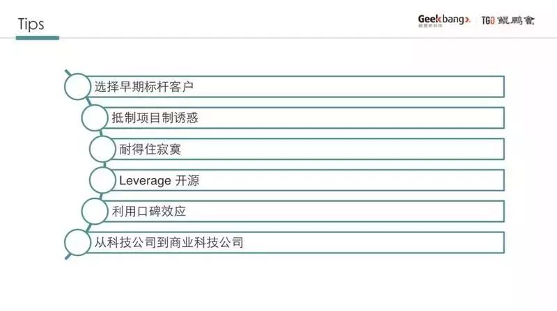 做 To Developer 创业时,首先切记勿贪大求全,其次找准目标客户是很重要的,目标客户一定是那种在你感觉自己还没有完全准备好的情况下,追上来要用你产品、要跟你合作的客户。